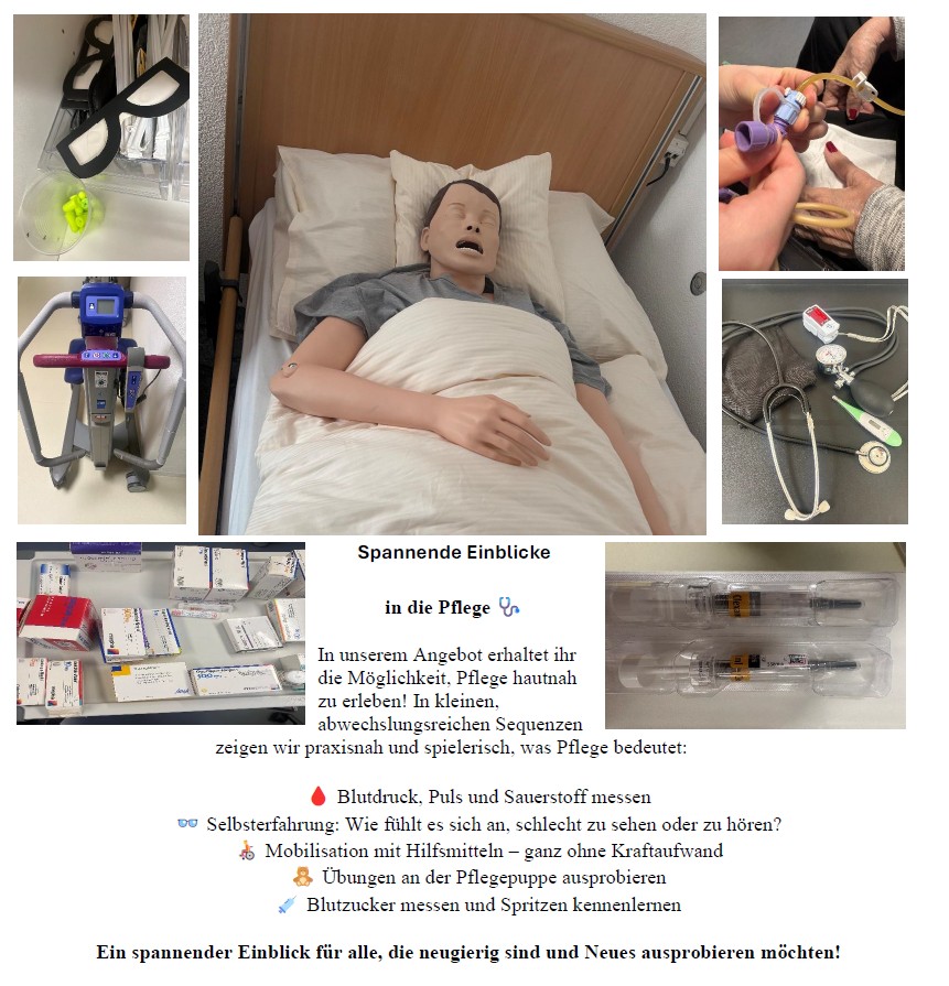 Blutdruckmessen, Spritzen lernen, Blutzuckermessung, Mobilisation mit Hilfsmitteln und Pflege an einer Übungspuppe